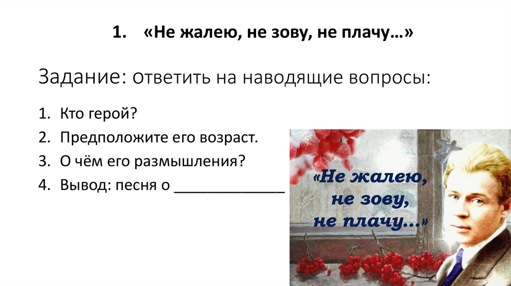 1. «Не жалею, не зову, не плачу…»Задание: ответить на наводящие вопросы: