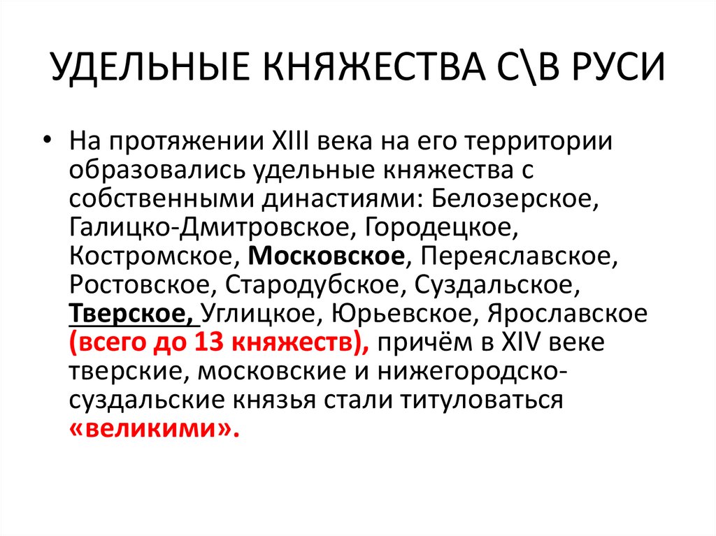 УДЕЛЬНЫЕ КНЯЖЕСТВА С\В РУСИ• На протяжении XIII века на его территории