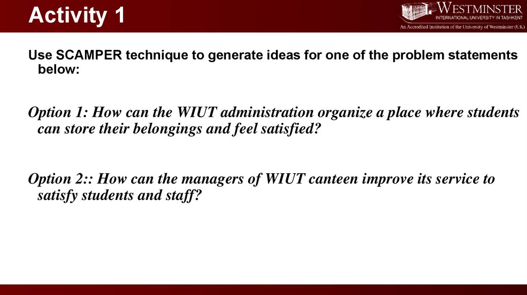 Activity 1Use SCAMPER technique to generate ideas for one of the problem statements