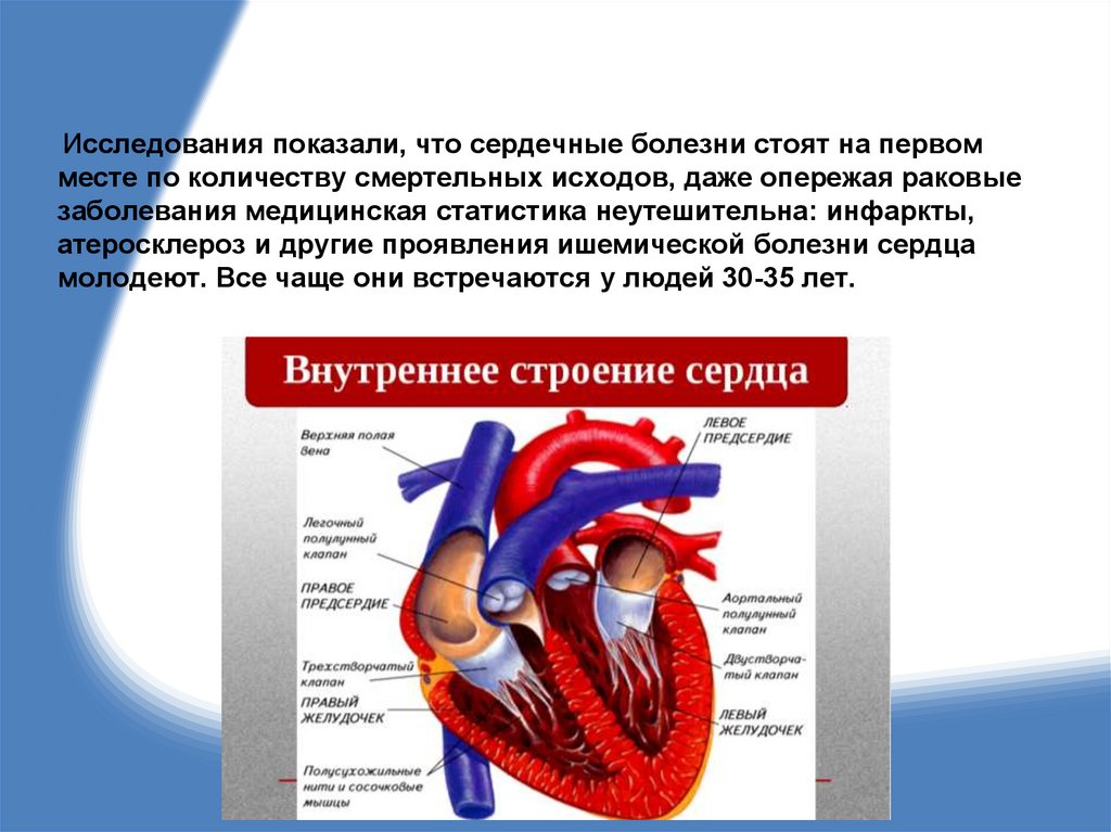 Исследования показали, что сердечные болезни стоят на первомместе по количеству смертельных исходов, даже опережая раковые