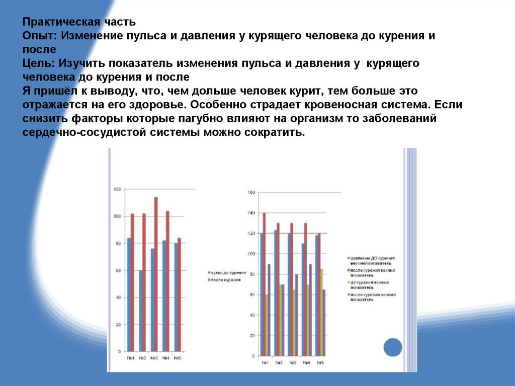 Практическая частьОпыт: Изменение пульса и давления у курящего человека до курения и