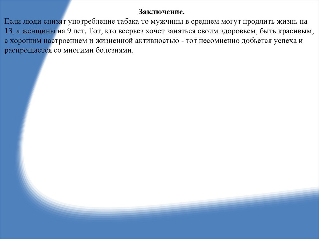 Заключение.Если люди снизят употребление табака то мужчины в среднем могут продлить жизнь на