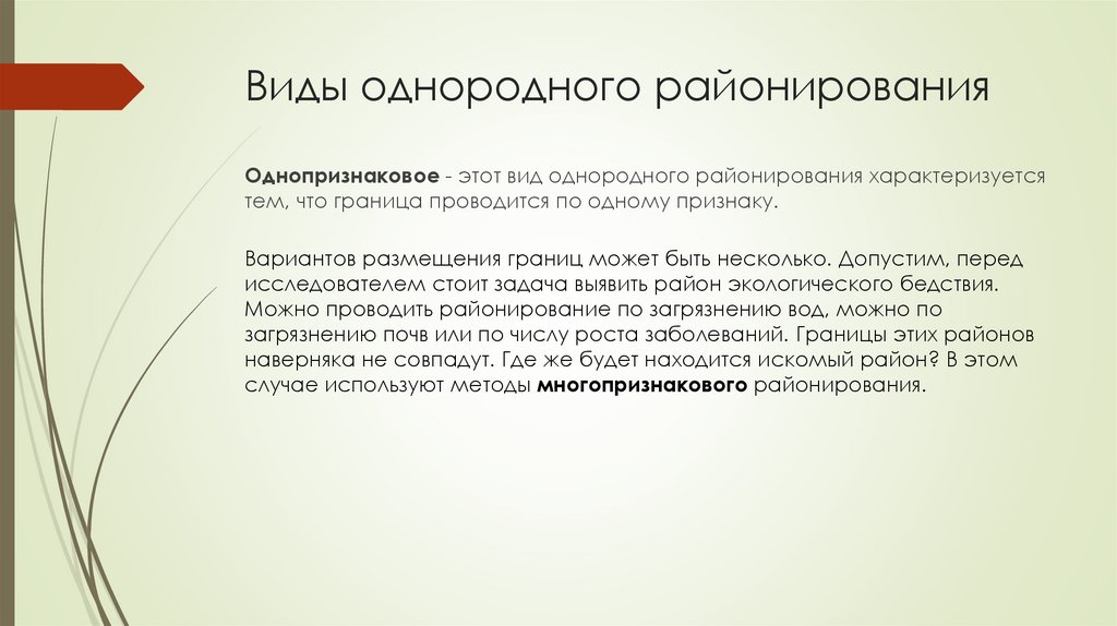 Виды однородного районированияОднопризнаковое - этот вид однородного районирования характеризуется