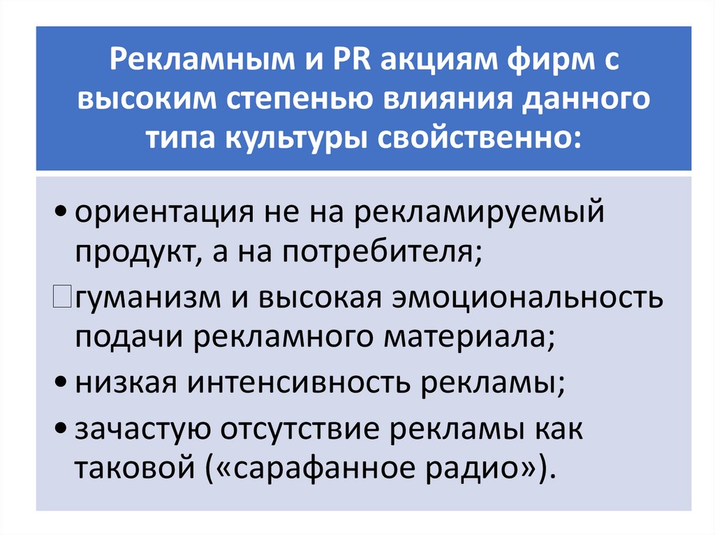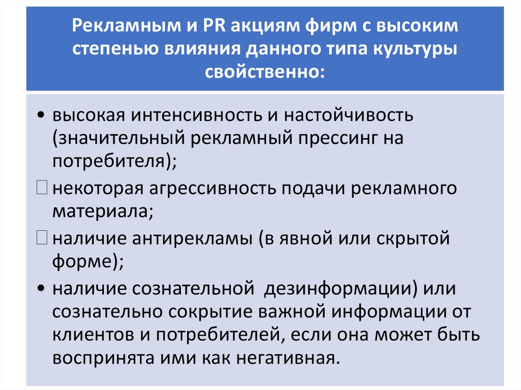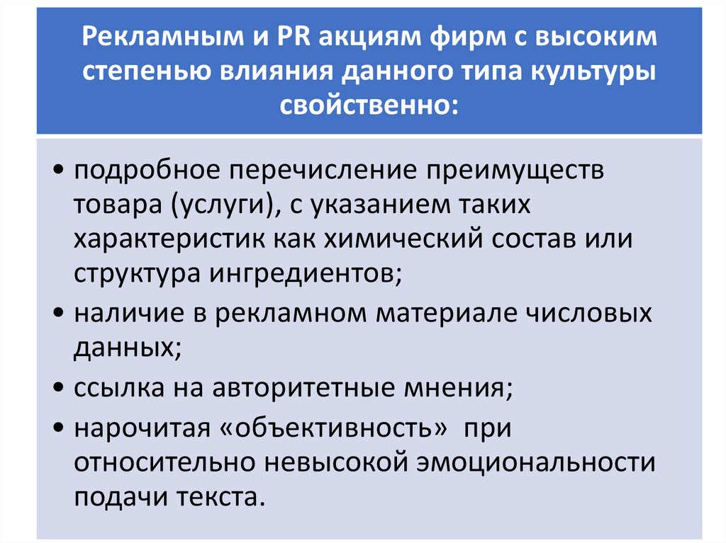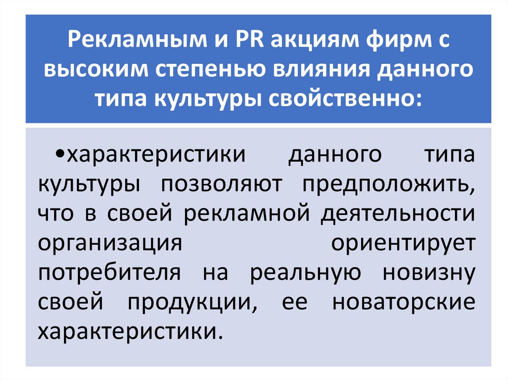 Рекламным и PR акциям фирм с высокимстепенью влияния данного типа культуры