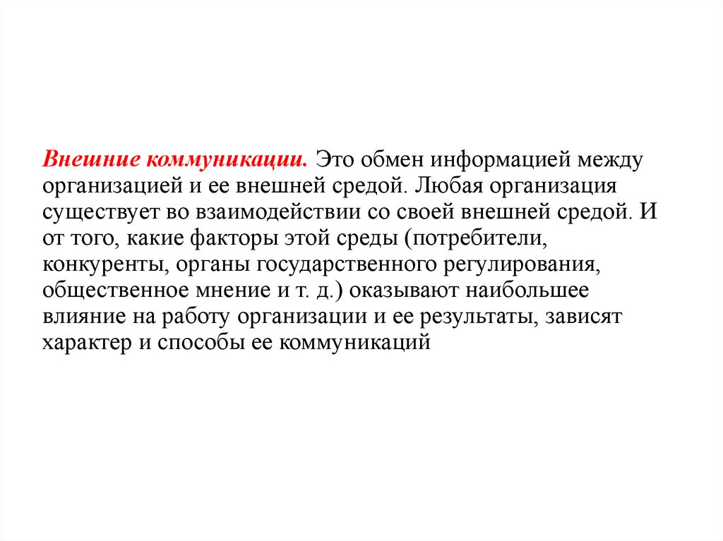 Внешние коммуникации. Это обмен информацией междуорганизацией и ее внешней средой. Любая организация