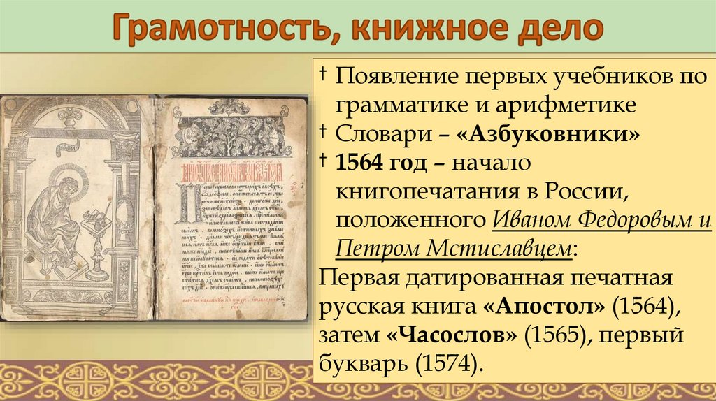 † Появление первых учебников пограмматике и арифметике
