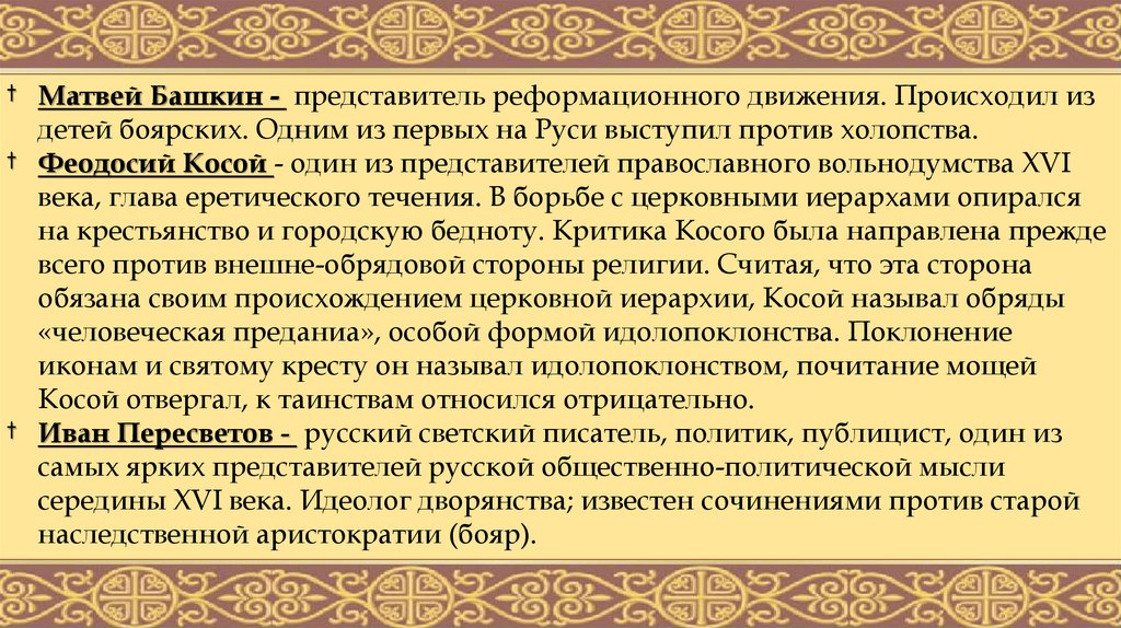 † Матвей Башкин - представитель реформационного движения. Происходил издетей боярских. Одним из первых на Руси выступил против холопства.