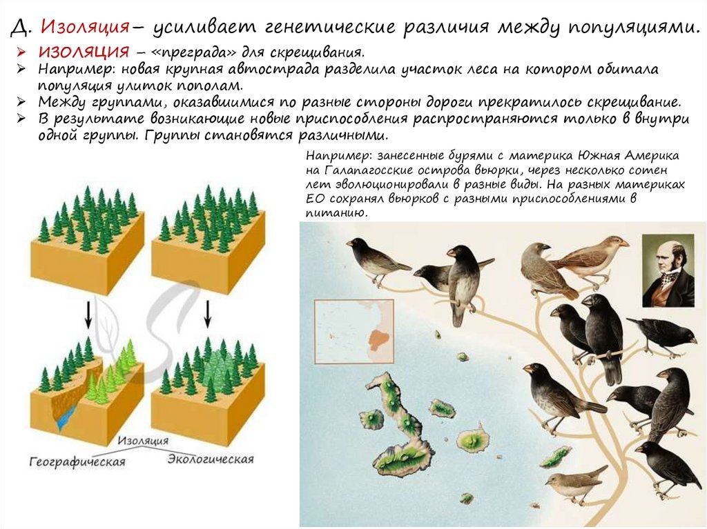 Д. Изоляция– усиливает генетические различия между популяциями.ИЗОЛЯЦИЯ – «преграда» для скрещивания.
