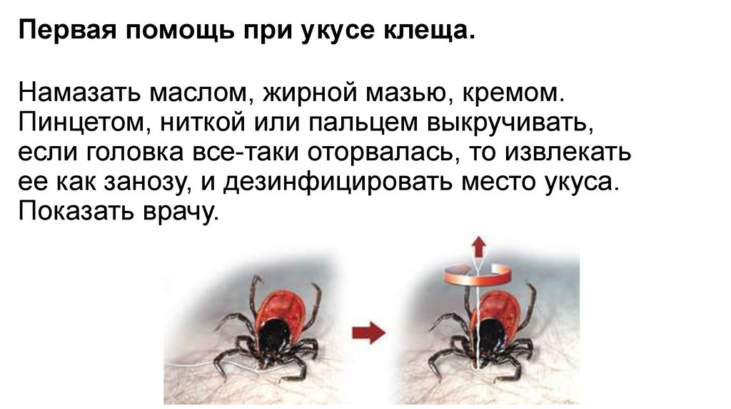 Первая помощь при укусе клеща.Намазать маслом, жирной мазью, кремом.