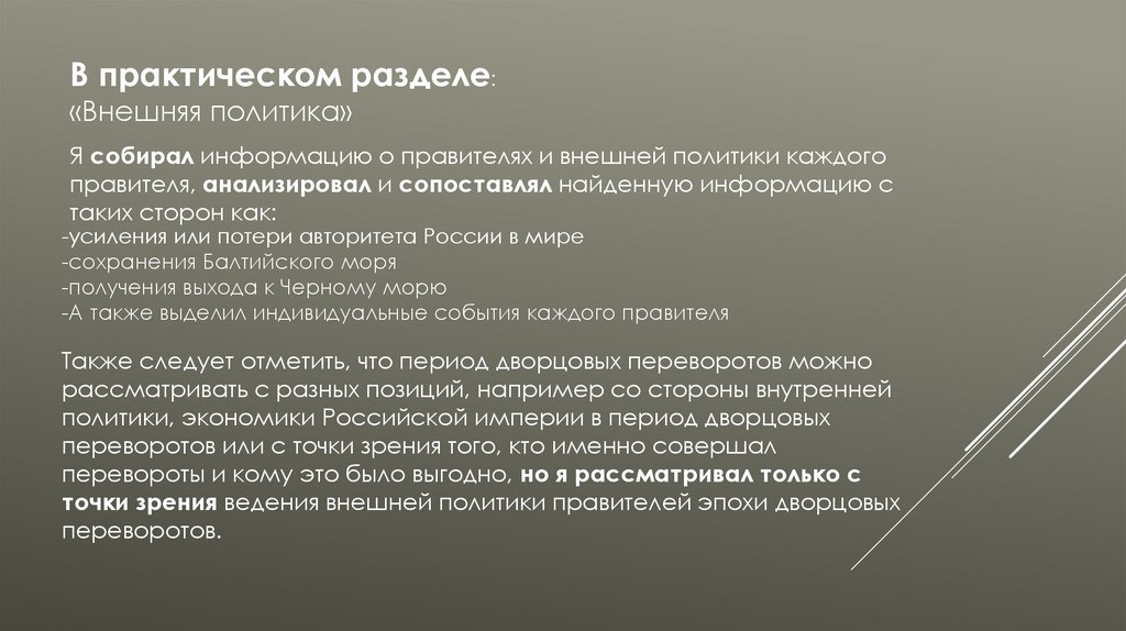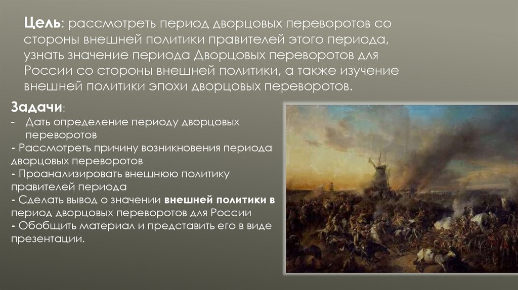 Цель: рассмотреть период дворцовых переворотов состороны внешней политики правителей этого периода,