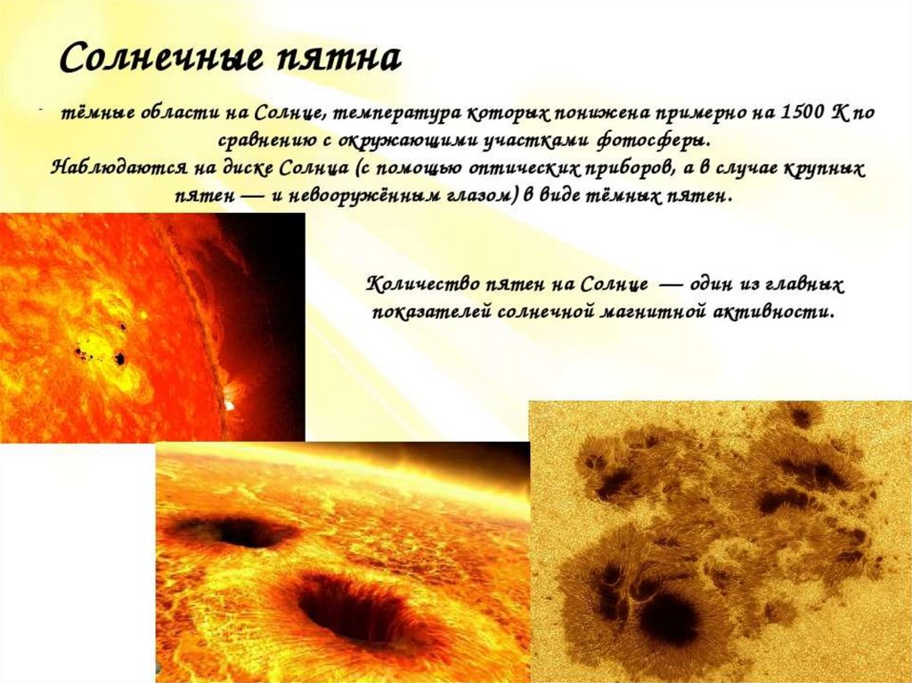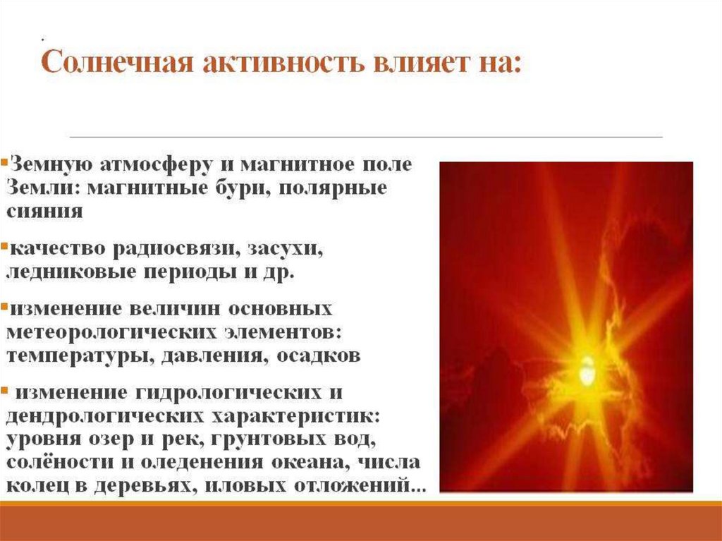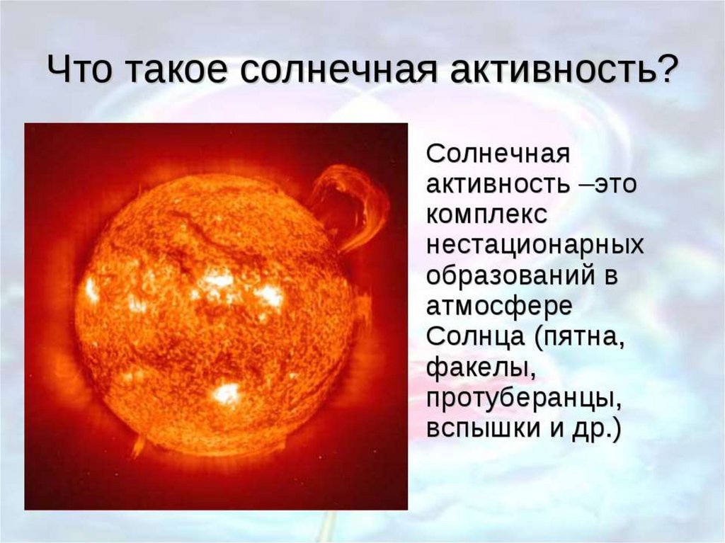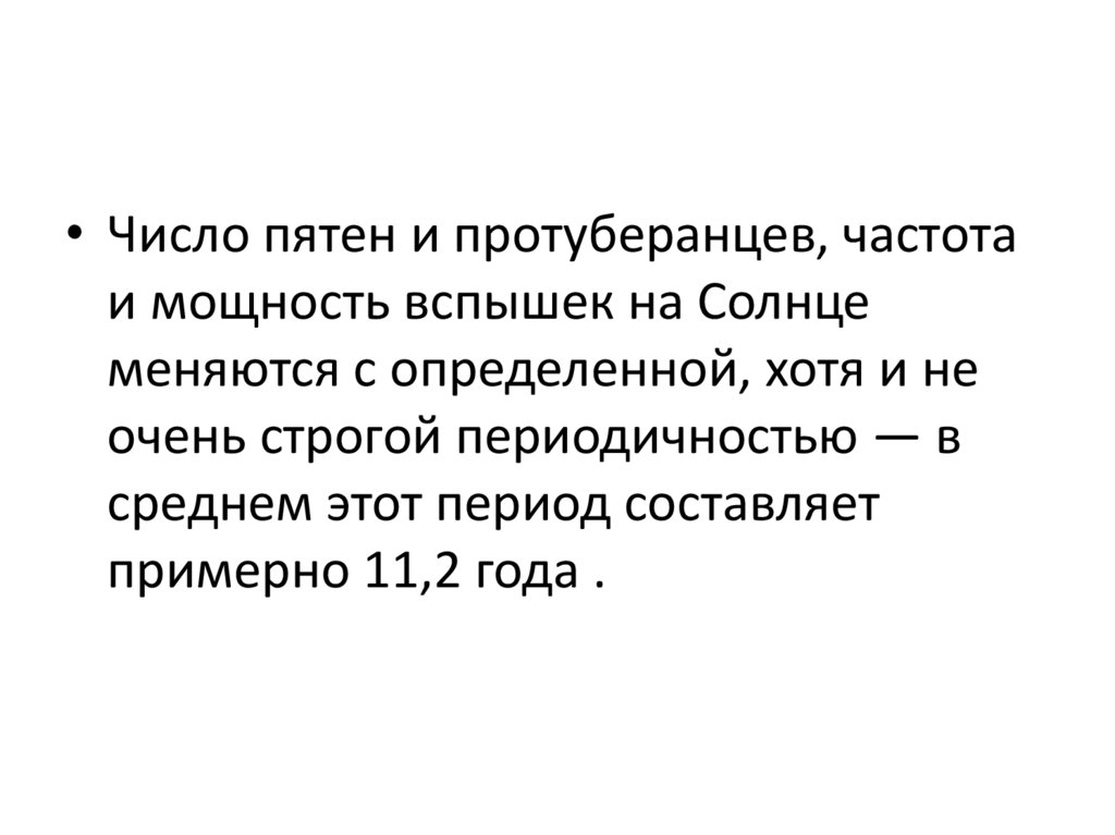 • Число пятен и протуберанцев, частотаи мощность вспышек на Солнце