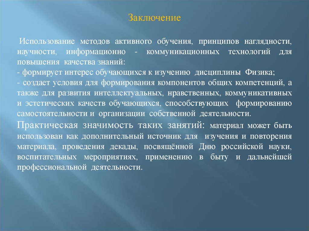 ЗаключениеИспользование методов активного обучения, принципов наглядности,