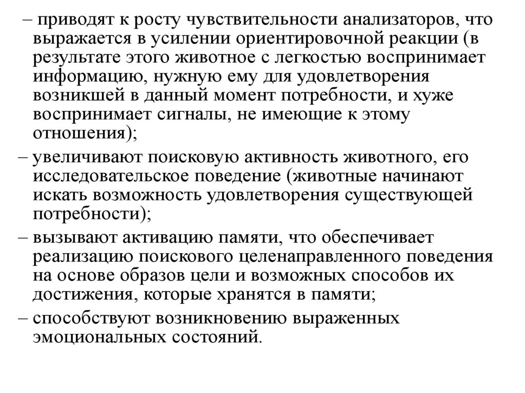 – приводят к росту чувствительности анализаторов, чтовыражается в усилении ориентировочной реакции (в
