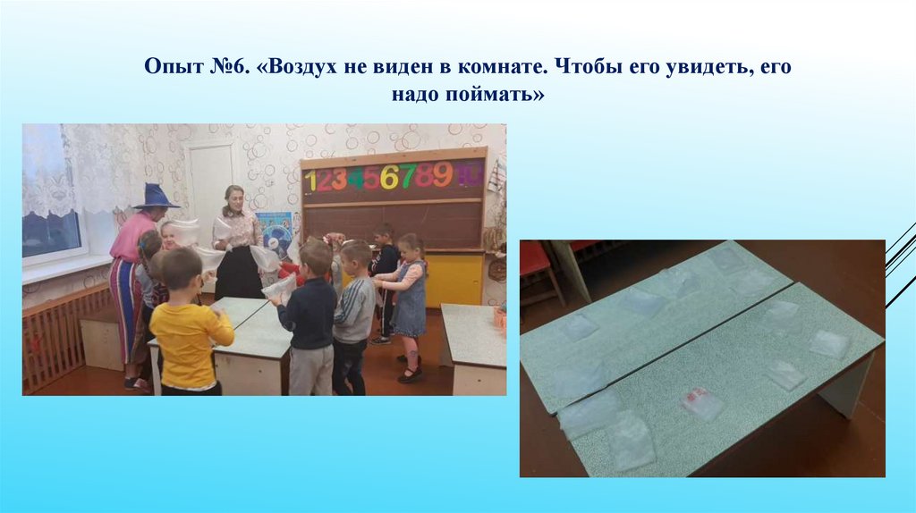Опыт №6. «Воздух не виден в комнате. Чтобы его увидеть, егонадо поймать»