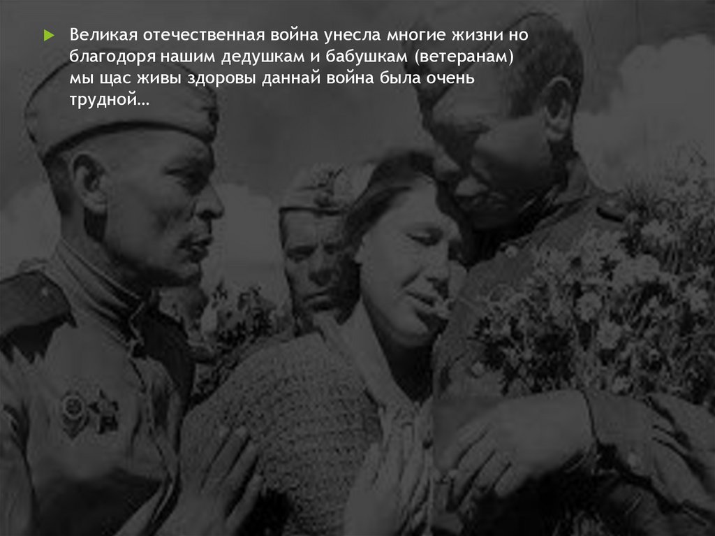 Великая отечественная война унесла многие жизни ноблагодоря нашим дедушкам и бабушкам (ветеранам)