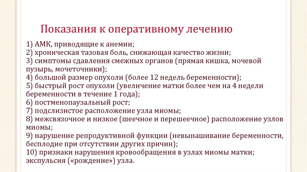 Показания к оперативному лечению1) АМК, приводящие к анемии;