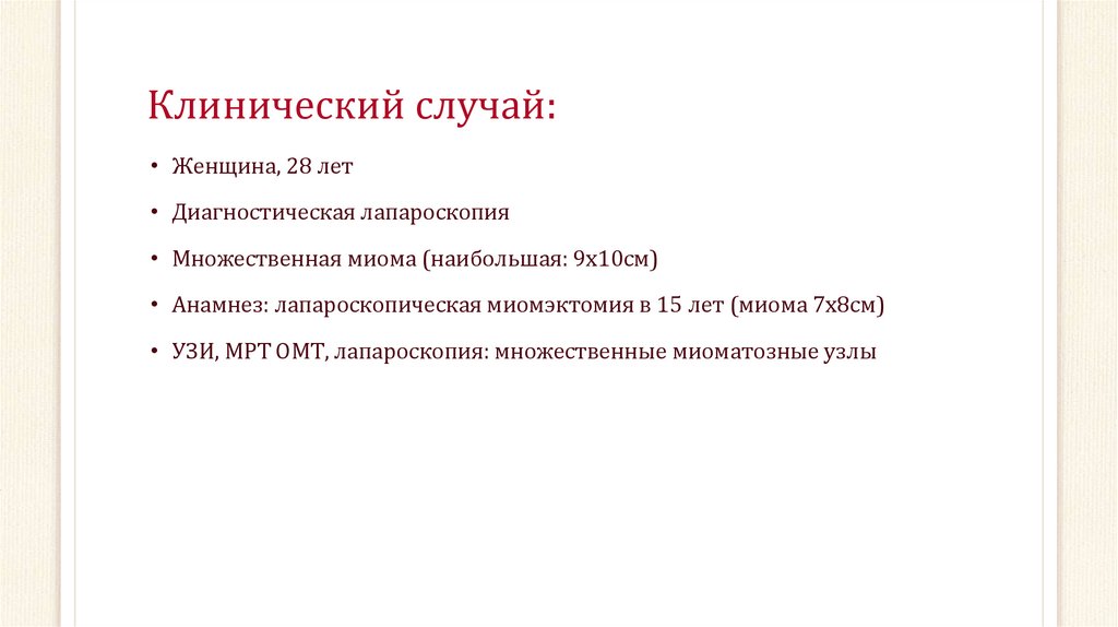 • Анамнез: лапароскопическая миомэктомия в 15 лет (миома 7х8см)