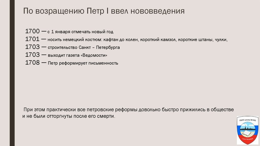 При этом практически все петровские реформы довольно быстро прижились в обществе
