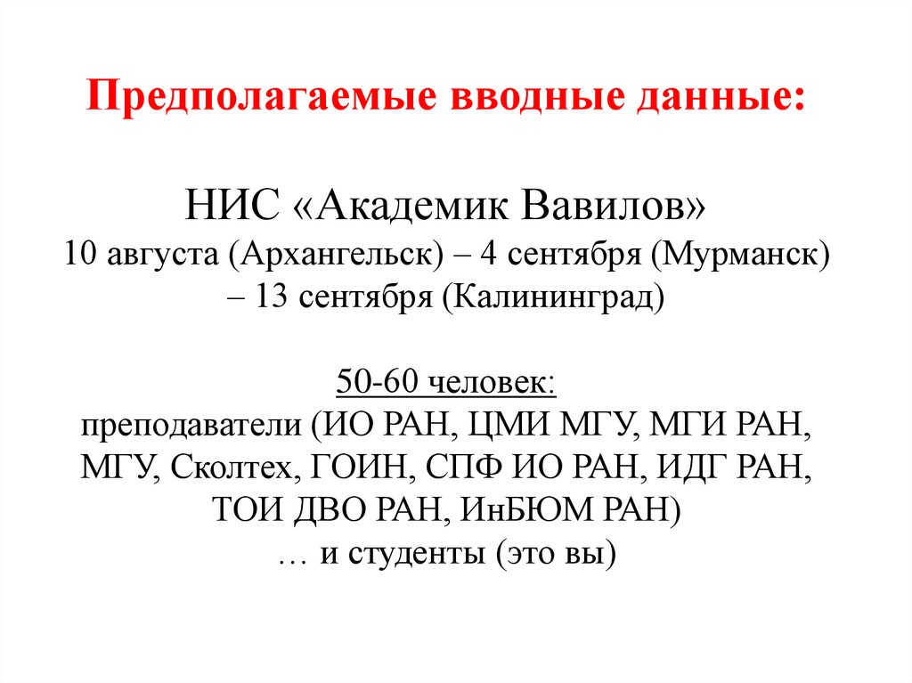 Предполагаемые вводные данные:НИС «Академик Вавилов»
