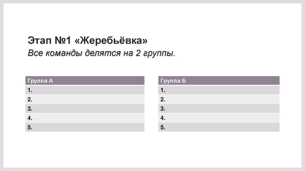 Этап №1 «Жеребьёвка»Все команды делятся на 2 группы.