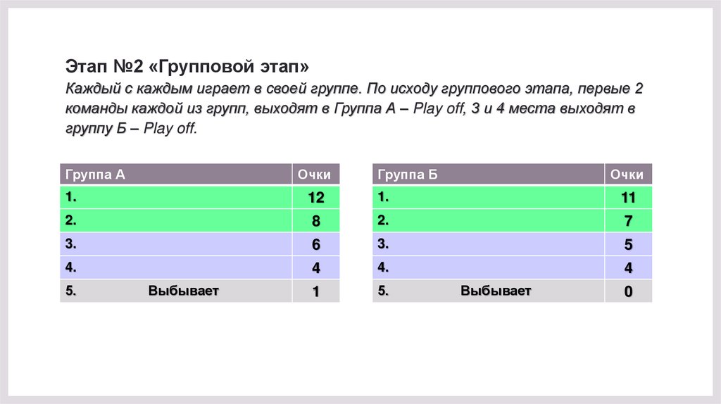 Этап №2 «Групповой этап»Каждый с каждым играет в своей группе. По исходу группового этапа, первые 2