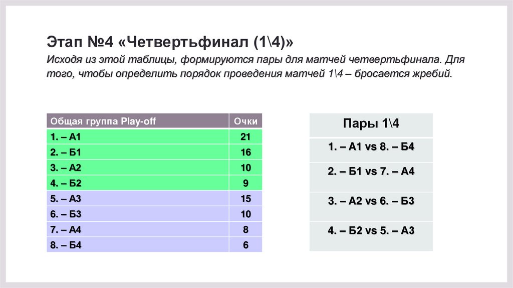 Этап №4 «Четвертьфинал (1\4)»Исходя из этой таблицы, формируются пары для матчей четвертьфинала. Для