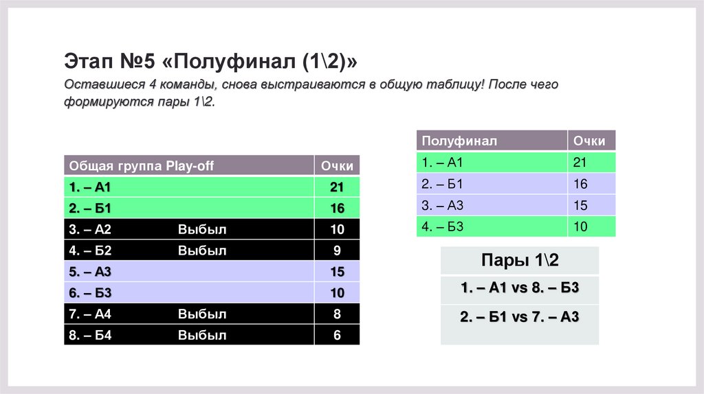 Этап №5 «Полуфинал (1\2)»Оставшиеся 4 команды, снова выстраиваются в общую таблицу! После чего