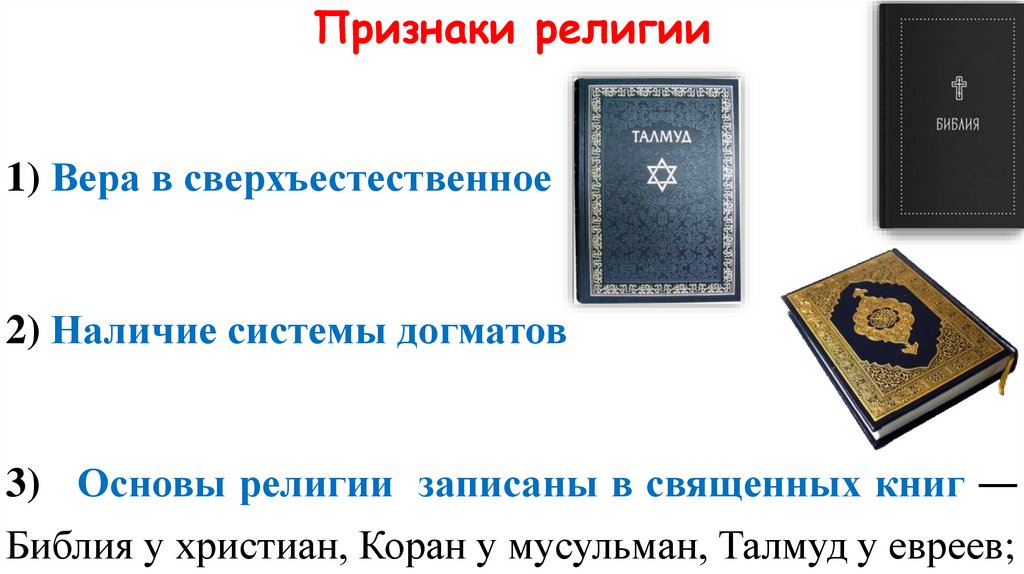 3) Наличие основ в виде священных книг ― Библия, Коран, Талмуд;