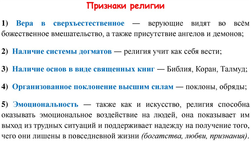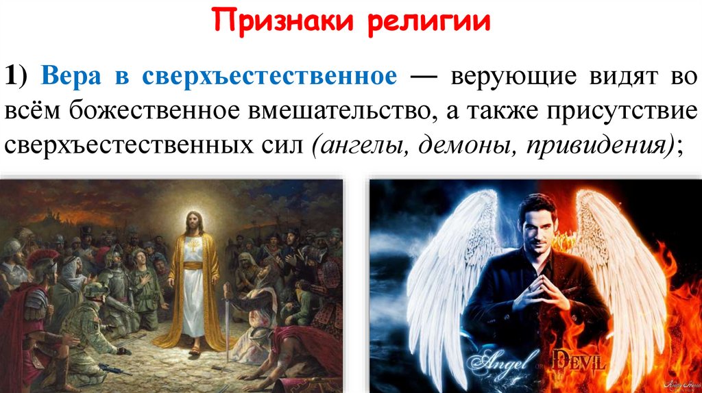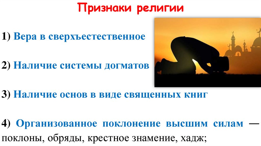 Признаки религии1) Вера в сверхъестественное ― верующие видят во