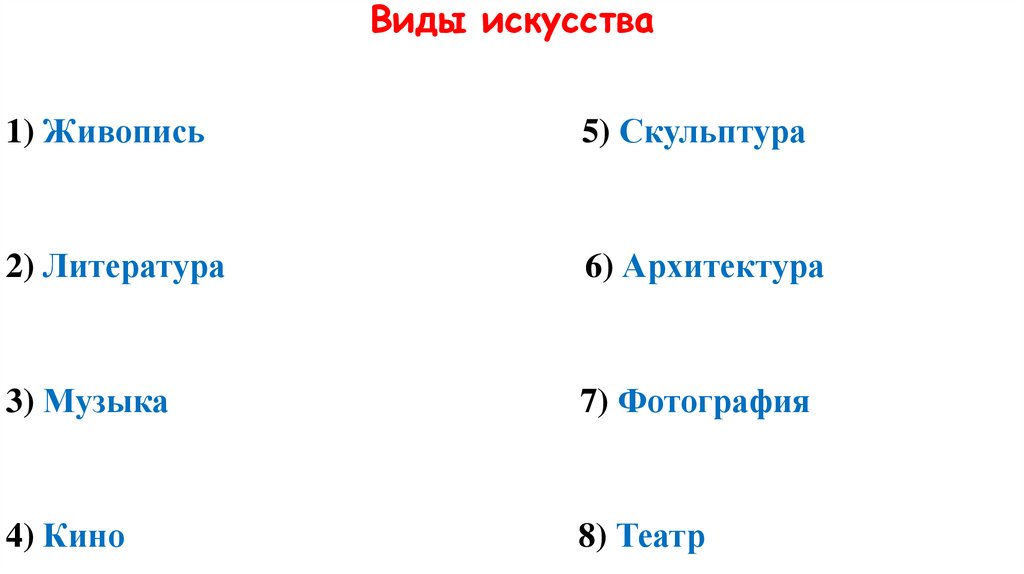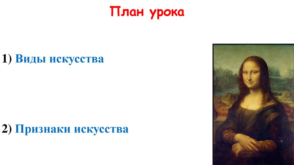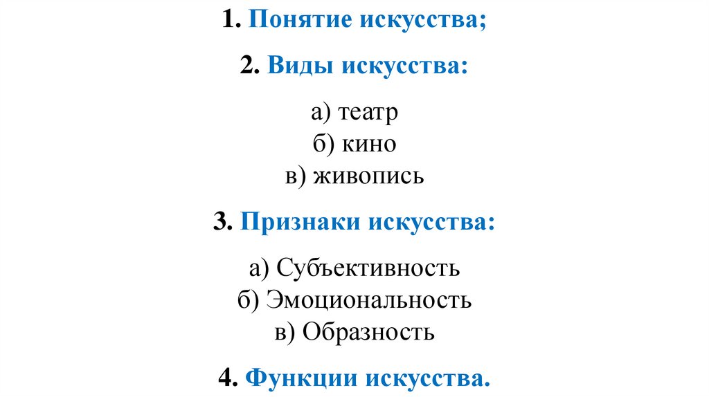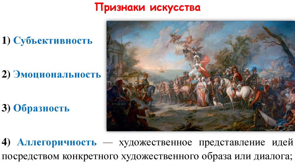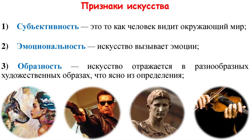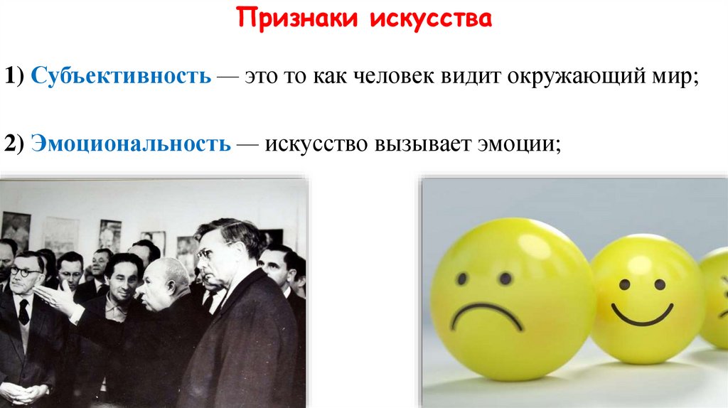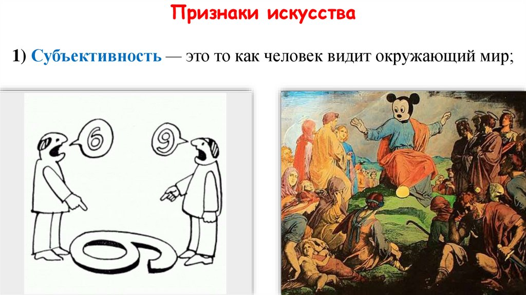 Признаки искусства1) Субъективность — это то как человек видит окружающий мир;