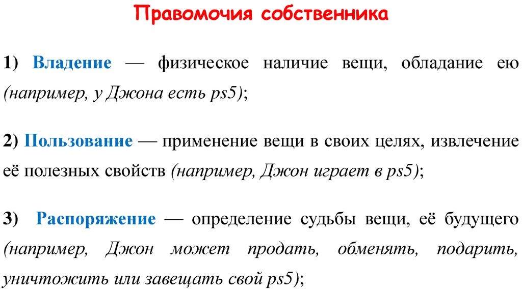 Правомочия собственника1) Владение — физическое наличие вещи, обладание ею