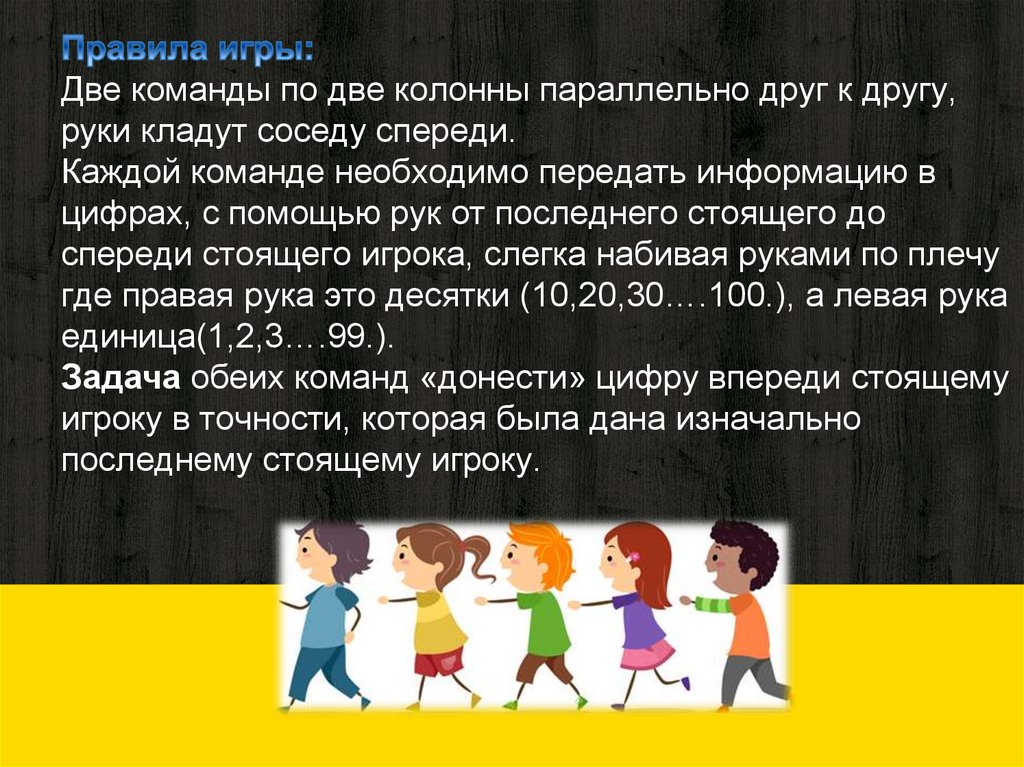 Две команды по две колонны параллельно друг к другу,руки кладут соседу спереди.