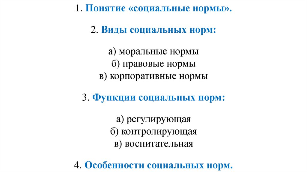 1. Понятие «социальные нормы».2. Виды социальных норм: