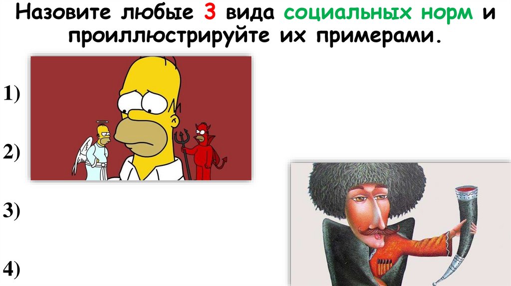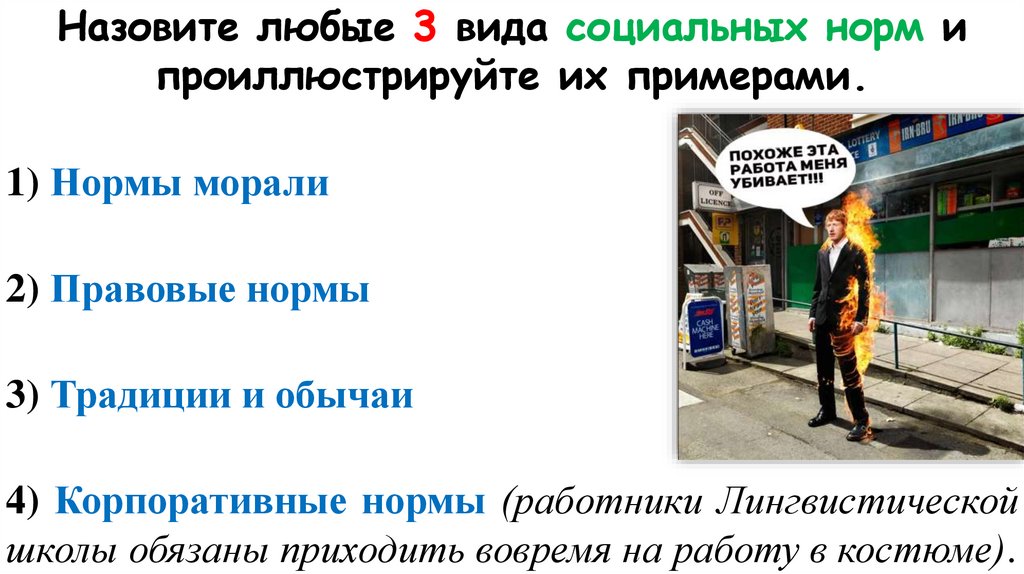 Назовите любые 3 вида социальных норм ипроиллюстрируйте их примерами.