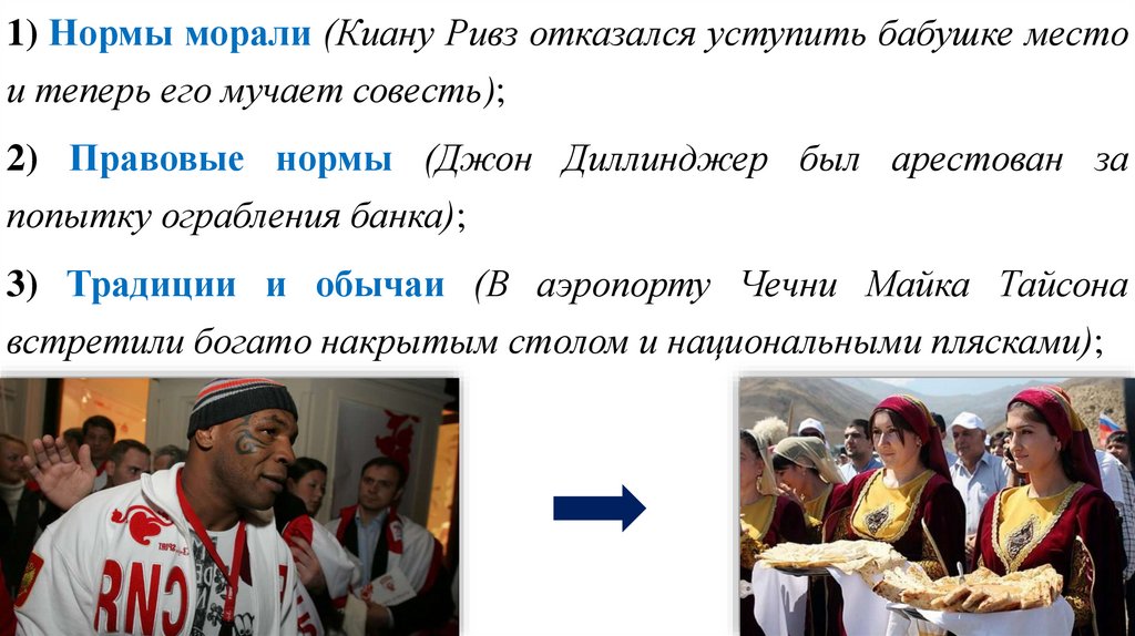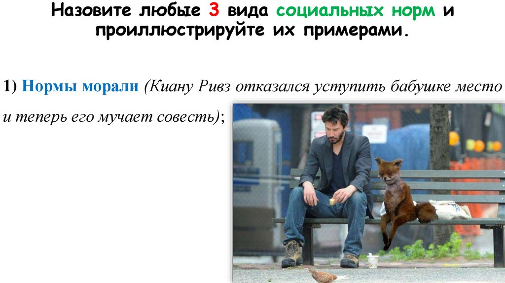 1) Нормы морали (Киану Ривз отказался уступить бабушке местои теперь его мучает совесть);