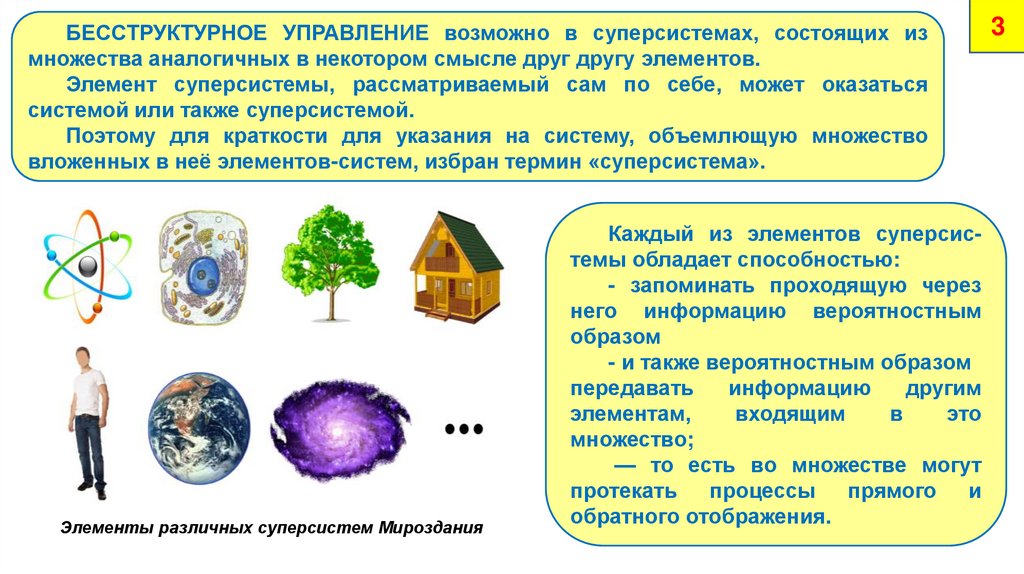 БЕССТРУКТУРНОЕ УПРАВЛЕНИЕ возможно в суперсистемах, состоящих измножества аналогичных в некотором смысле друг другу элементов.