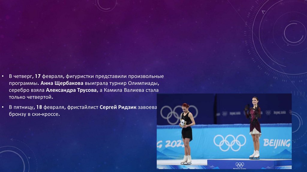 • В четверг, 17 февраля, фигуристки представили произвольныепрограммы. Анна Щербакова выиграла турнир Олимпиады,