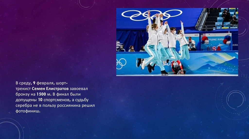 В среду, 9 февраля, шорттрекист Семен Елистратов завоевалбронзу на 1500 м. В финал были