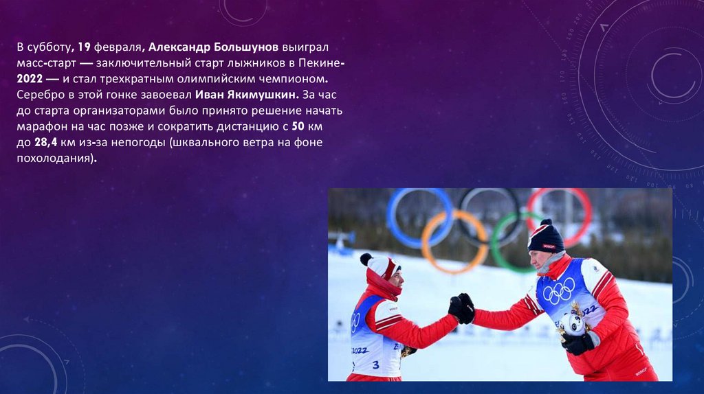 В субботу, 19 февраля, Александр Большунов выигралмасс-старт — заключительный старт лыжников в Пекине2022 — и стал трехкратным олимпийским чемпионом.