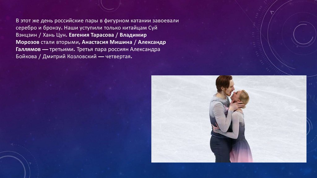 В этот же день российские пары в фигурном катании завоевалисеребро и бронзу. Наши уступили только китайцам Суй