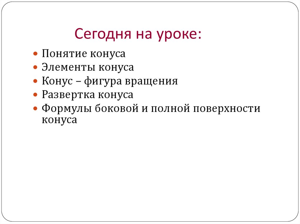 Сегодня на уроке:Понятие конуса