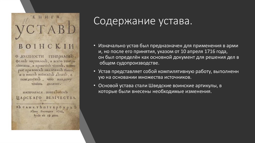 Содержание устава.• Изначально устав был предназначен для применения в арми