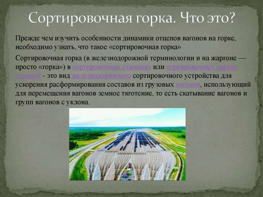 Прежде чем изучить особенности динамики отцепов вагонов на горке,необходимо узнать, что такое «сортировочная горка»
