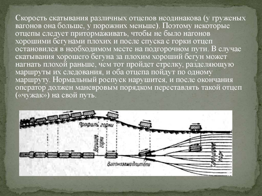 Скорость скатывания различных отцепов неодинакова (у груженыхвагонов она больше, у порожних меньше). Поэтому некоторые