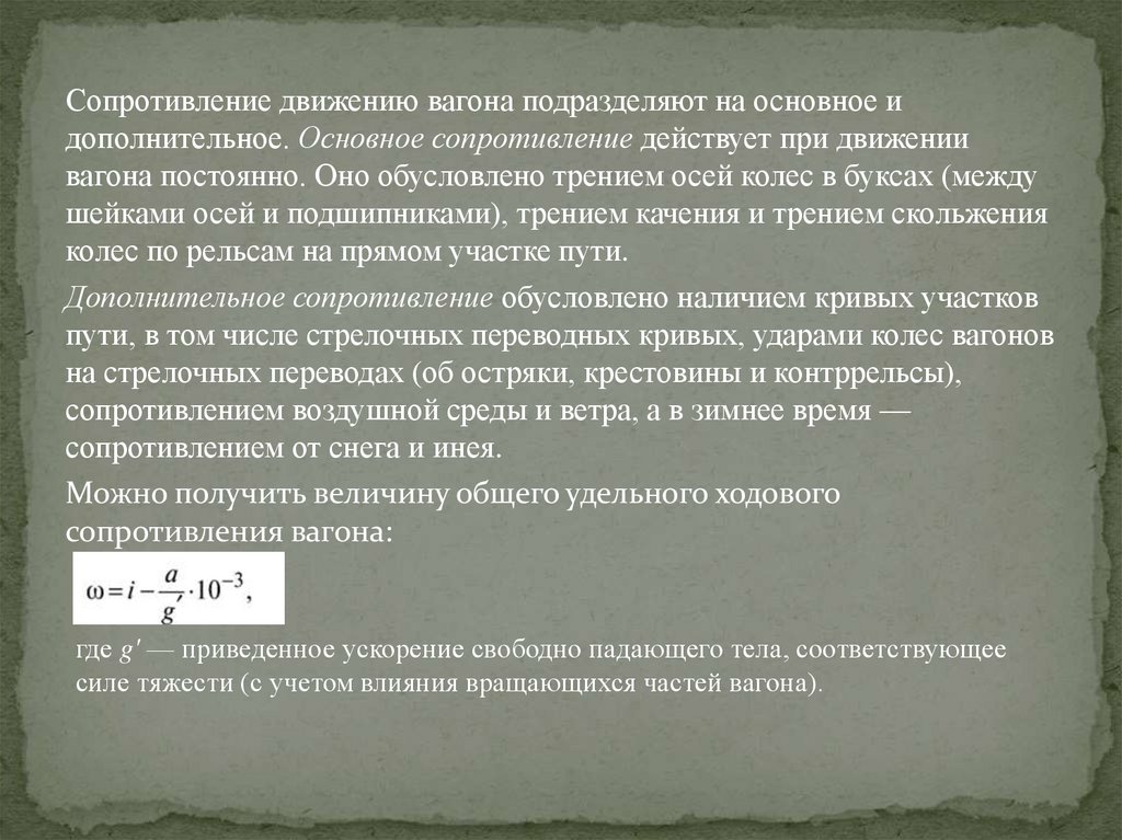 Сопротивление движению вагона подразделяют на основное идополнительное. Основное сопротивление действует при движении