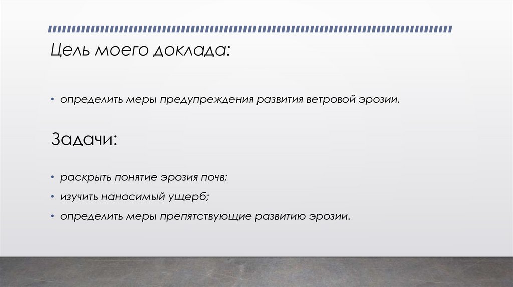 Цель моего доклада:• определить меры предупреждения развития ветровой эрозии.
