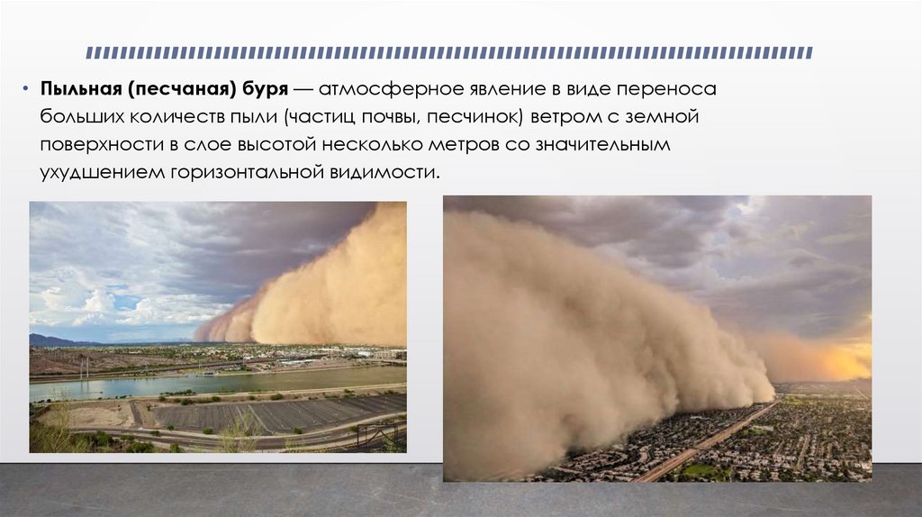 • Пыльная (песчаная) буря — атмосферное явление в виде переносабольших количеств пыли (частиц почвы, песчинок) ветром с земной