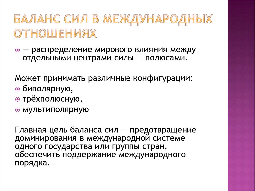 — распределение мирового влияния междуотдельными центрами силы — полюсами.