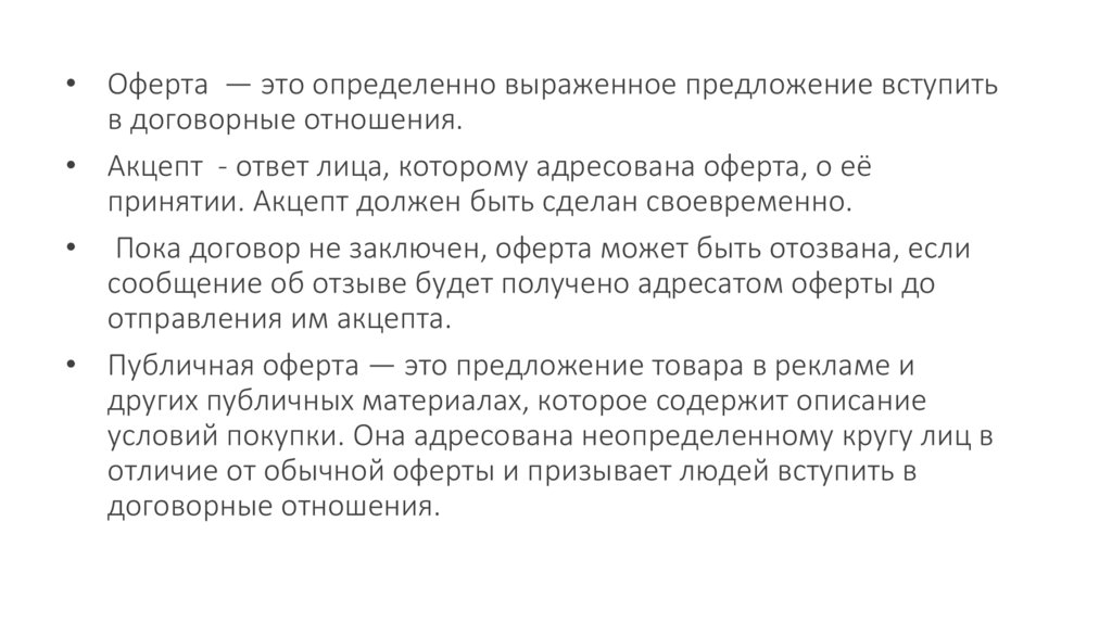 • Оферта — это определенно выраженное предложение вступитьв договорные отношения.