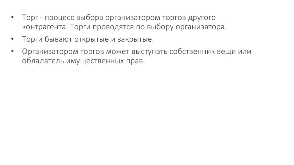 • Торг - процесс выбора организатором торгов другогоконтрагента. Торги проводятся по выбору организатора.